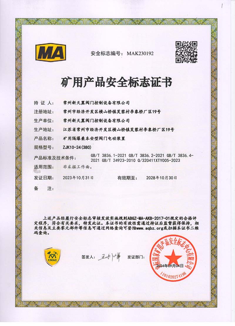 礦用產(chǎn)品安全標志證書ZJK180-24(380)