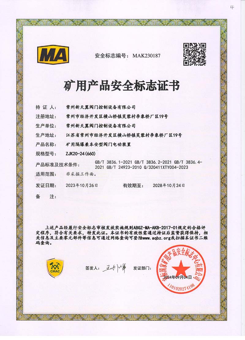 礦用產(chǎn)品安全標志證書ZJK180-24(660)