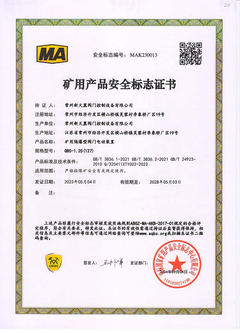 礦用產(chǎn)品安全標志證書QB20-1(380)