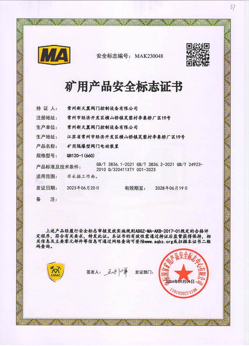 礦用產(chǎn)品安全標志證書ZJK120-24(660)