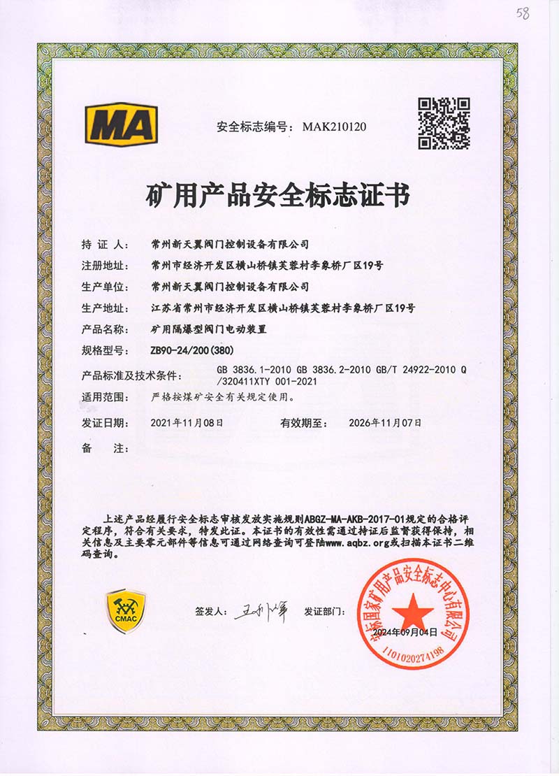 礦用產(chǎn)品安全標志證書ZB30-24 200(660)