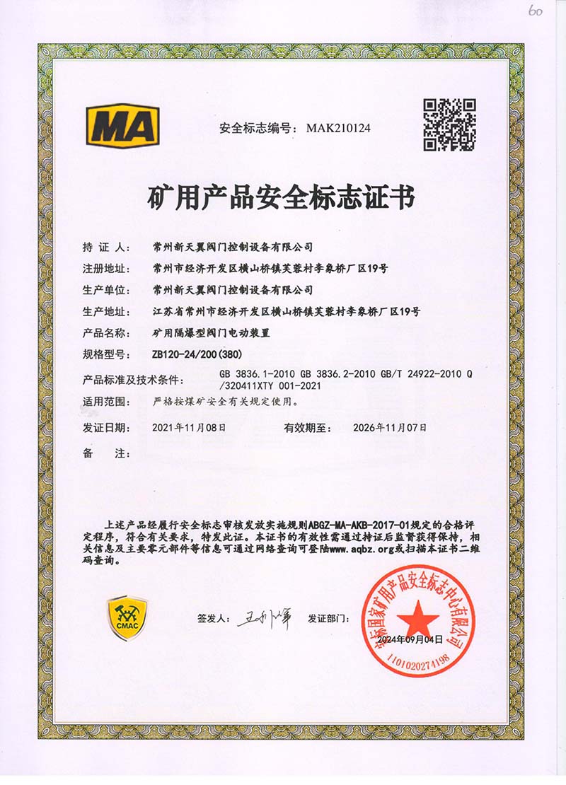 礦用產(chǎn)品安全標志證書ZB60-24 200(660)