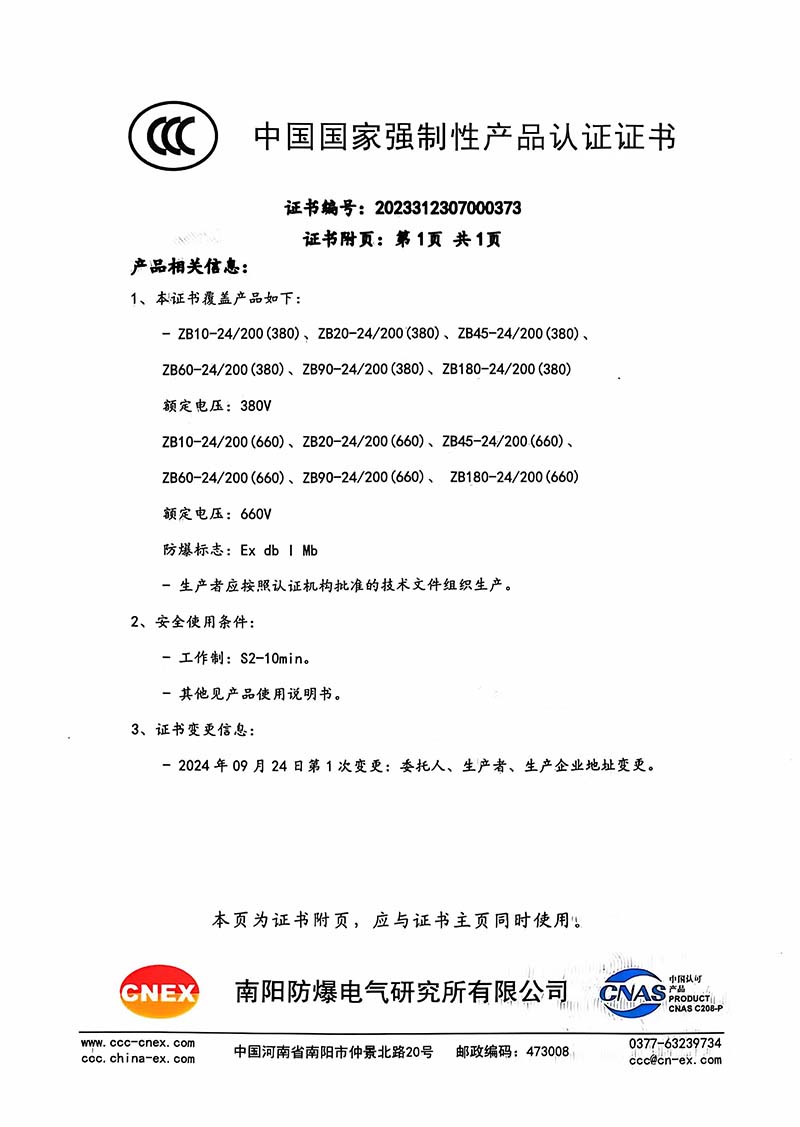 礦用隔爆ZB10-24中國國家強制性產(chǎn)品認證證書110.1