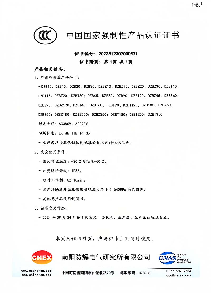 隔爆型DZB 中國國家強制性產(chǎn)品認證證書108.1